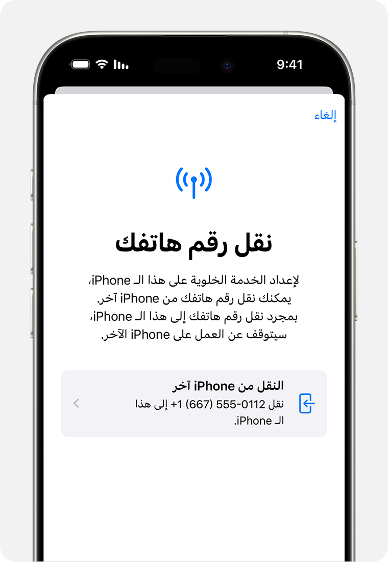 إذا كنت تنقل الشريحة الإلكترونية من جهاز غير Apple إلى iPhone، فيجب عليك التواصل معنا لنقل شريحتك الإلكترونية إما عن طريق eSIM Carrier Activation (تفعيل شركة الاتصالات للشريحة الإلكترونية) أو عن طريق تقديم رمز QR. إذا اشتريت iPhone مباشرة من Apple أو من شركة اتصالات في الولايات المتحدة، فقد تكون الشركة قد عينت شريحة إلكترونية بالفعل لجهازك. اتبع التعليمات التي تظهر على الشاشة لنقل الشريحة الإلكترونية. إذا كنت لا ترى التعليمات على الشاشة، فتواصل مع خدمة العملاء.